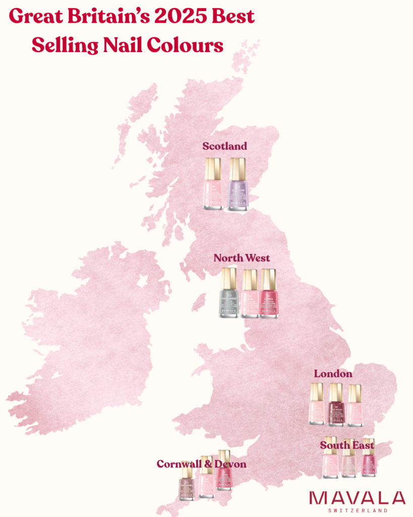 From Cornwall to Scotland, one thing is clear: baby pink is still the nation’s go-to. Mavala’s Mini Color in shade Riga was a best seller in every region! However, digging into the data shows distinct regional personalities emerging.